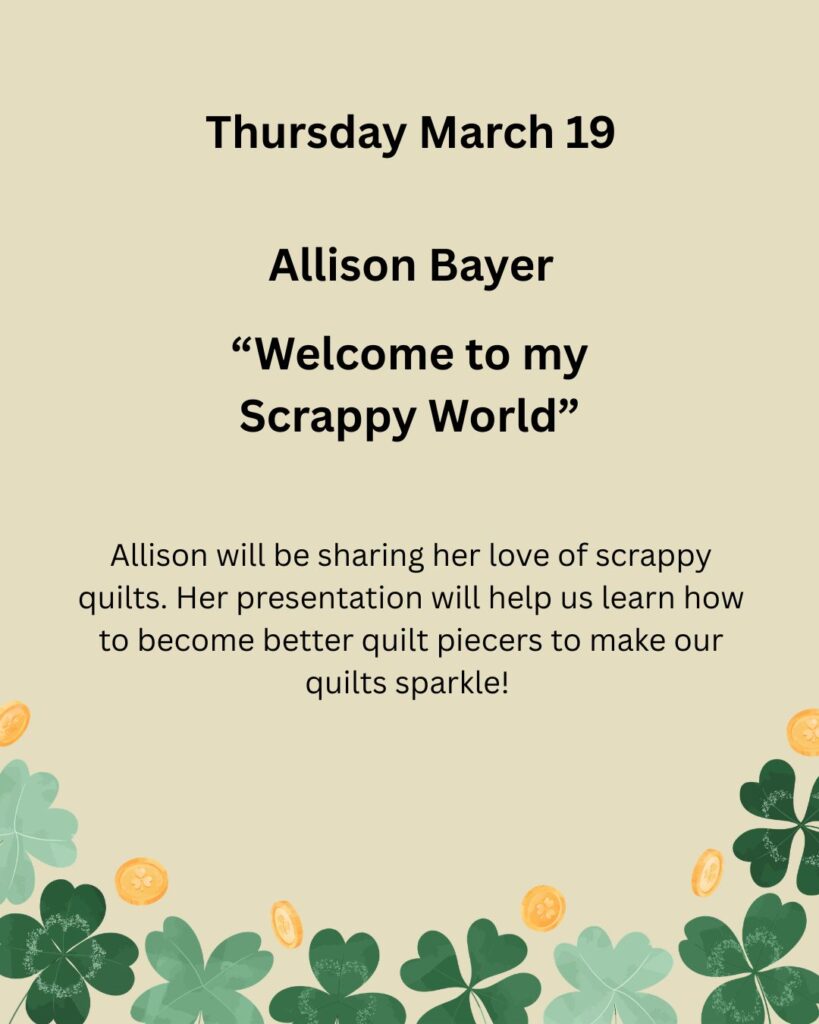 Calling all quilters in the Allen area. Join us for monthly programs, great friendships and all the creativity you can stand. AQG meets the 3rd Thursday of each month from 6:00 p.m. – 8:30 p.m. Join us from 6:00-6:30 for social time and our meeting is from 6:30-8:30.